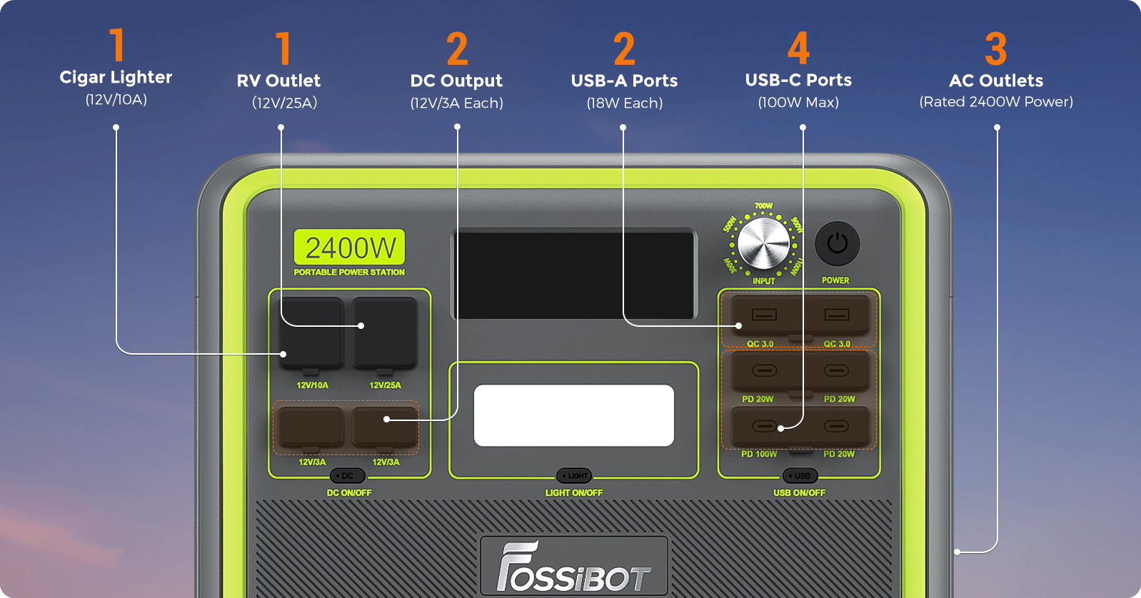 F2400 specially designed a rotating knob for adjusting the input power from 300W to 1100W, which decides the recharging speed.