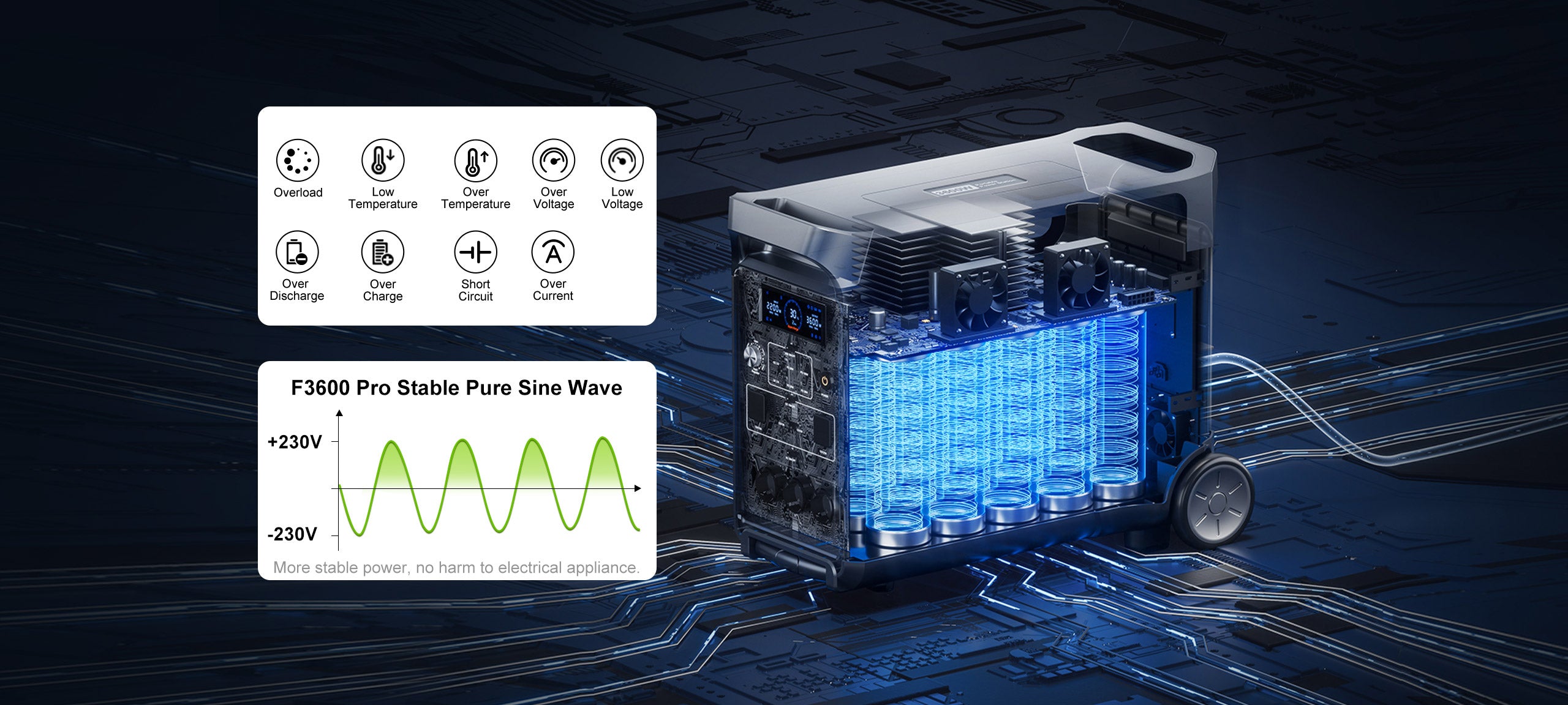 A: F3600 supports 3600W high power, it can power for 99% of your household appliances. If you want to know how many appliances you can use at one time, calculate the total wattage of your devices. F3600 should work if the load doesn't exceed its rated 3,600W. When the load power exceeds 3,600W, the machine will reduce the voltage to make the load work stably. When the voltage is lower than 177V or loads reaches 5900W, the machine activates overload protection and stops working.