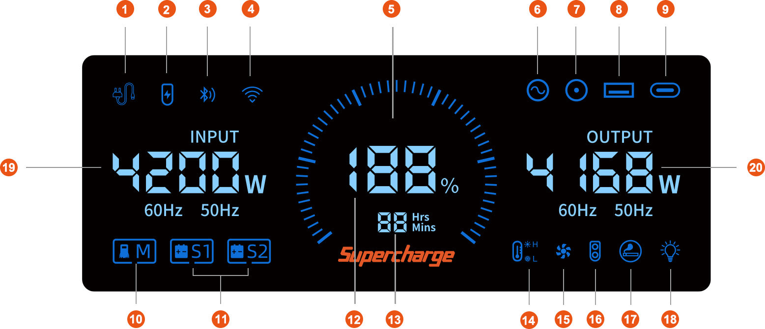 1) Press and hold the AC button for 2 seconds to enter the frequency switching mode, the 50Hz or 60Hz icon will flash on the display, short press the AC button again to select 50Hz or 60Hz; when the icon stops flashing and displays 50Hz or 60Hz, it indicates the switch is successful.