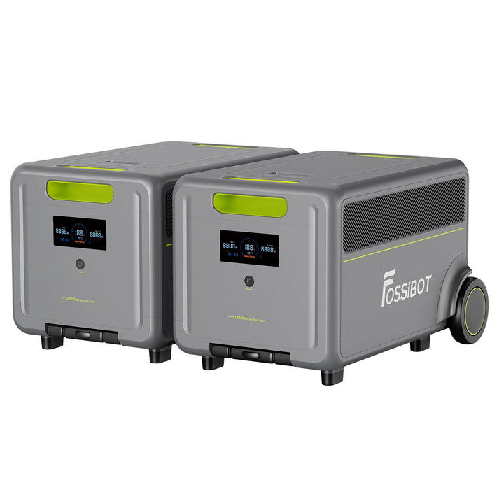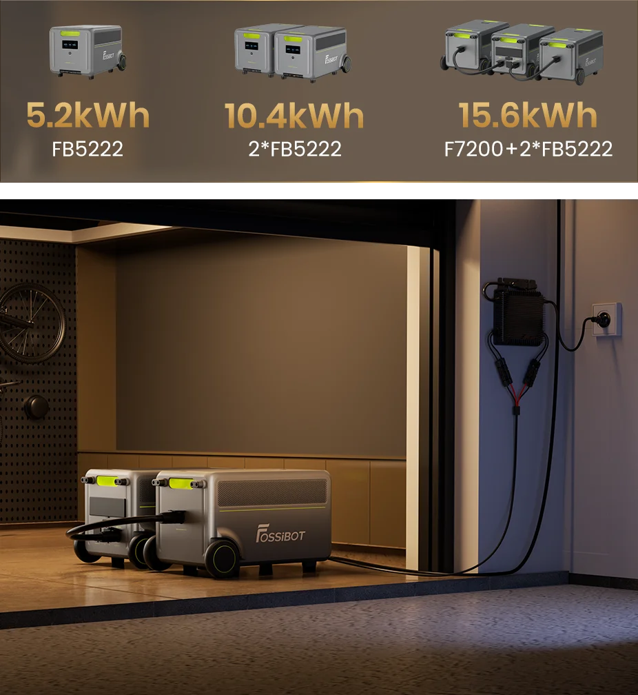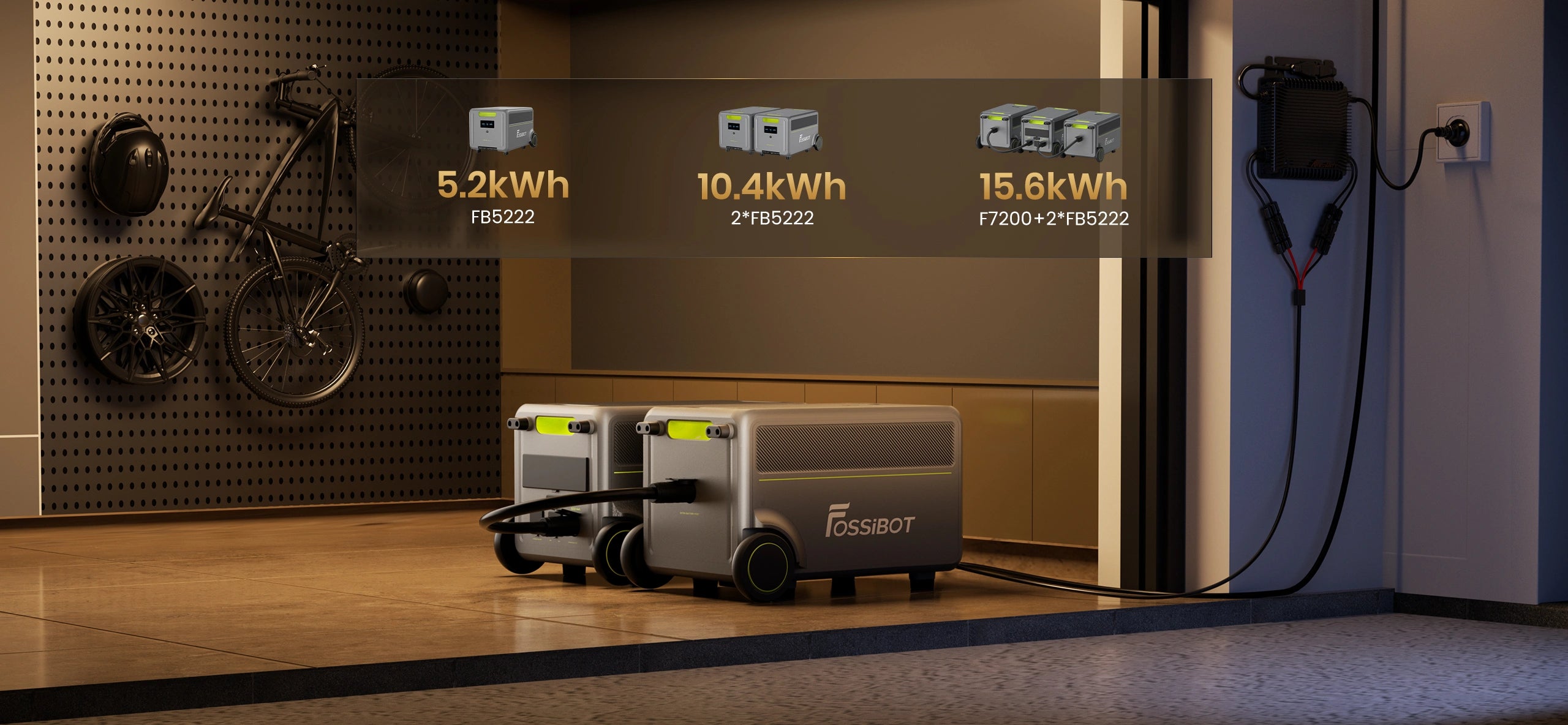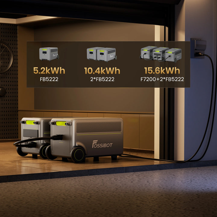 Each FB5222 unit provides 5.2KWh. Connecting one doubles the capacity to 10.4KWh, while connecting two triples to 15.6KWh. This ensures days of power for essential appliances with the FOSSiBOT F7200.
