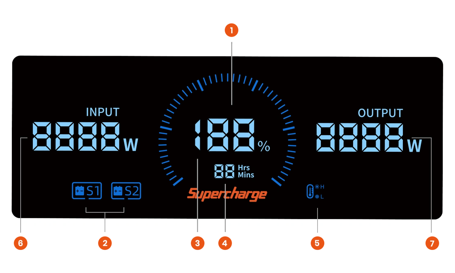 By connecting to the F7200, you can recharge the FB5222 and the main unit simultaneously with 5200W max power com-bining 3000W AC,2500W high voltage solar and 1200W low voltage solar power.